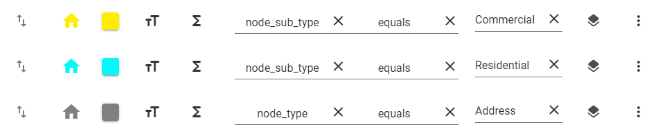 First we set the scene by creating rules for an address with no sub type (a default address), a residential address, and a commercial address. I changed the icon, the colors, increased the size to 30, and defined what the style is for.