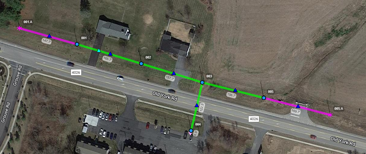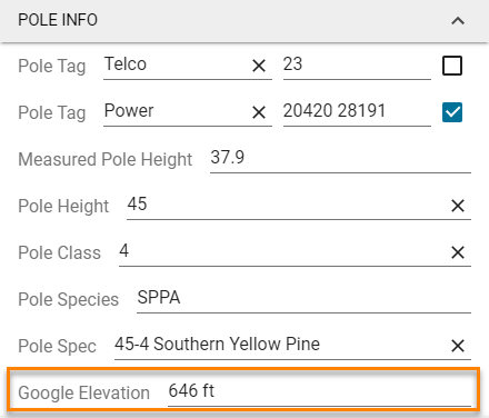 The Google Elevation tool will place the elevation directly onto the Node Info of each pole. This can be used to measure rise and fall of the pole line, as well as calculating uplift for pole replacements.