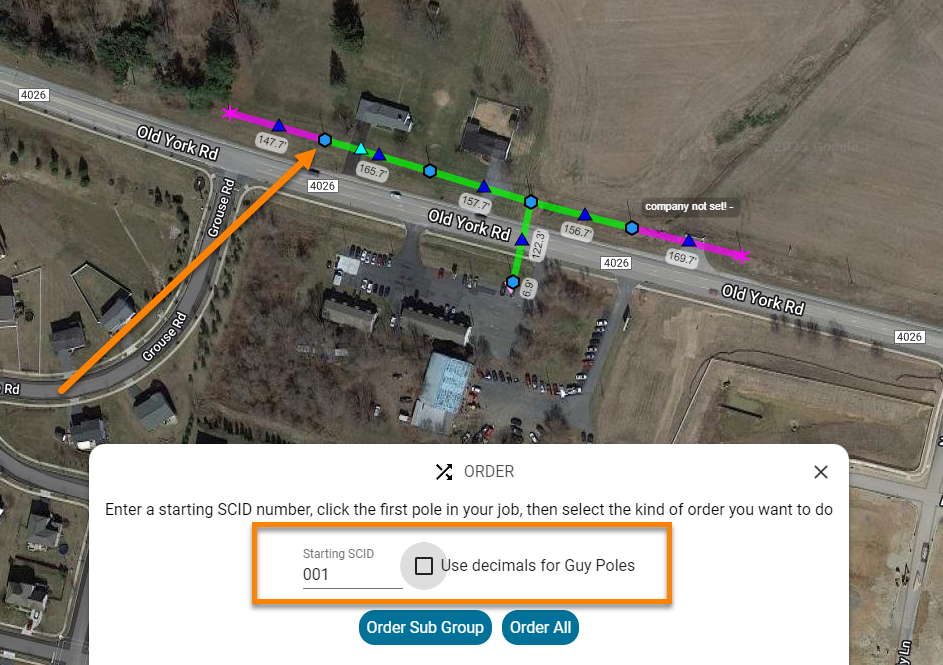 When you click on the Order tool, a window will pop up at the bottom of the Map page. In this window, you can set the number for the starting SCID. (SCID stands for Sequentially Coded IDentifier. It logically orders the poles and other nodes in the job.) In the window you also have the option to use decimals for guy poles (i.e. 001.1).