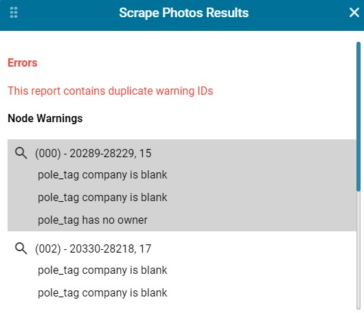 Once you make your selection, the Scrape Photo Results window will pop up to show nodes that need to be updated with data (i.e. the company needs to be entered for the pole_tag attribute). Here, you can click on the magnifying glass icon to go to the location or you can click the “X” to close the window and go through the job pole by pole to update information.