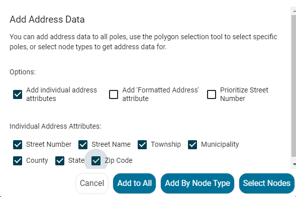 When you click on the Address Data tool, the "Add Address Data" window will pop up for you to select various options. At the bottom you can select which address attributes you wish to add to the node locations, such as Street Number, Zip Code, and County. Select or deselect the address attributes you want to show up on your nodes. Once you have the appropriate ones selected, you have the option to select all nodes ("Add to All"), select nodes by type ("Add By Node Type"), or manually select which nodes will get address data ("Select Nodes").