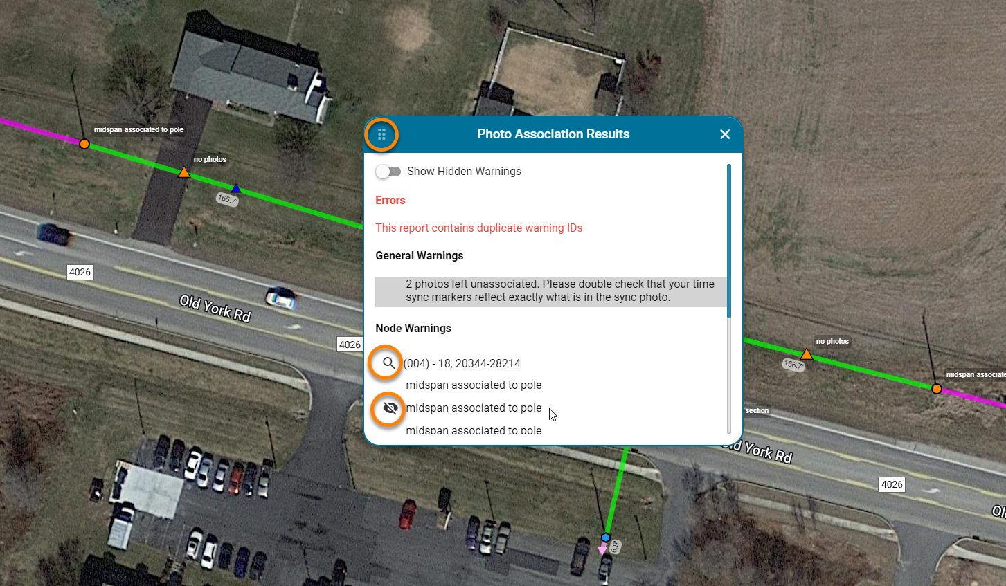 The 6 vertical dots (in the first orange circle in the image above) are a handle that you can use to click and drag the Photo Association Results window around the Maps page. If you want to hide a warning, hover over the warning to make the icon of an eye with a slash through it (in the bottom orange circle) appear. Click on that icon to hide the warning.